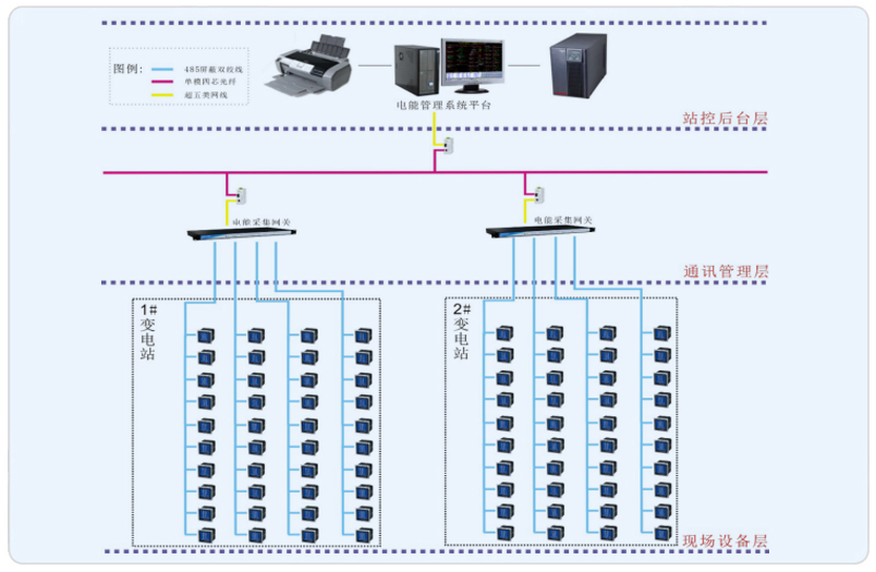 本項目主要是針對海南昌建逸海國際廣場內(nèi)的10KV/0.4KV的1#,2#變電所設計一套電力監(jiān)控系統(tǒng)。主要是采集10kV多功能網(wǎng)絡儀表電力參數(shù)、開關帶電指示儀開關狀態(tài)及0.4kV變電站多功能儀表的電參量,現(xiàn)場智能表計采用RS485總線組網(wǎng)接入電能管理系統(tǒng),系統(tǒng)主機安裝在1#變電所內(nèi)。