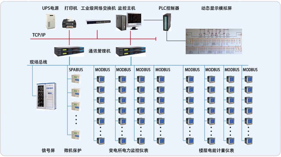 整個系統(tǒng)采用網(wǎng)絡(luò)分布式結(jié)構(gòu),監(jiān)控主機(jī)位于地下一層變電所值班室內(nèi),各變電所配電柜內(nèi)安裝有本公司ACR330ELH、ACR220EFLK儀表共計200多回 路,第三方設(shè)備共計200多臺。系統(tǒng)采用開放的通訊協(xié)議,通過現(xiàn)場總線與高低壓配電系統(tǒng)、變壓器溫控裝置、直流屏、模擬屏實(shí)現(xiàn)數(shù)據(jù)通訊功能。同時監(jiān)視系統(tǒng)提供標(biāo)準(zhǔn)的RS485接口向上連接到BMS系統(tǒng)。