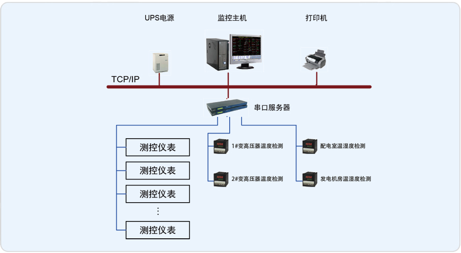 系統主要實現中國建設銀行股份有限公司云南分行本部地下B2變電所的0.4kV配電系統進行用電監測與電能管理;監測范圍為改造變電所的T1、T2變壓器的饋線柜、母聯柜、電容補償柜,變壓器的相間溫度、配電室和發電機房的溫濕度,饋線柜和母聯柜側儀表進行遠程實時監控和電能管理。該系統總計有29只儀表,分4條總線,都是直接通過屏蔽雙絞線走管道拉至值班室后連接到串口服務器上,實現總線上儀表與監控主機的數據連通。