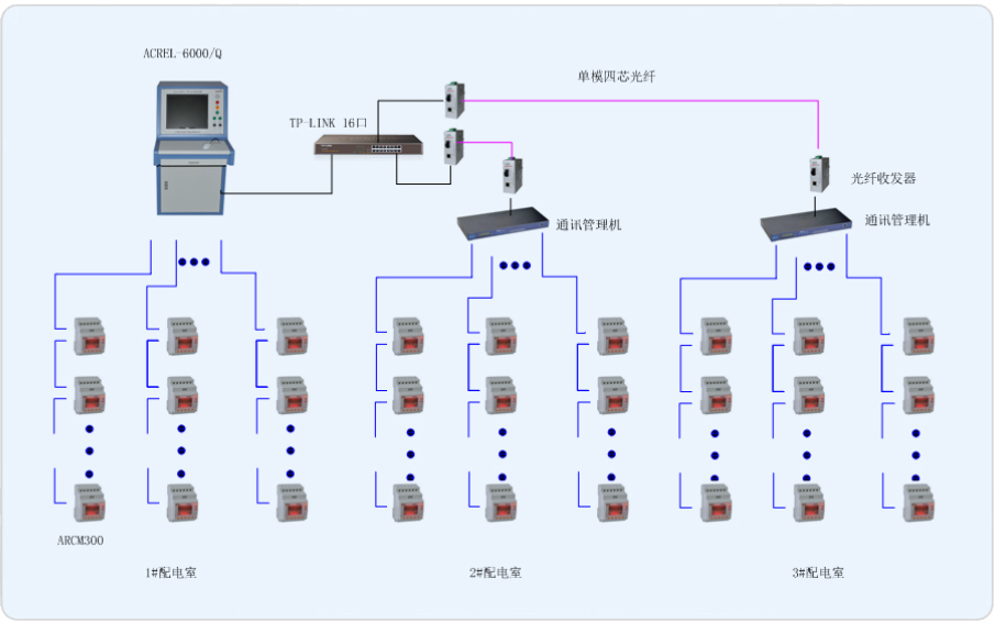 系統(tǒng)組網(wǎng)共分為站控管理層、網(wǎng)絡(luò)通訊層、現(xiàn)場設(shè)備層三層,該項目通訊總線共接入20條通訊總線,總線在樓層配電箱手拉手串接后,接入Acrel-6000/Q電氣火災(zāi)監(jiān)控設(shè)備,組成電氣火災(zāi)系統(tǒng)的大動脈。箱體中漏電流互感器通過電流線接入漏電探測器,漏電探測器實時顯示漏電情況,組成一套信號穩(wěn)定,精度可靠的電氣火災(zāi)監(jiān)測系統(tǒng)?,F(xiàn)場共有449只ARCM系列電氣火災(zāi)探測器模塊。