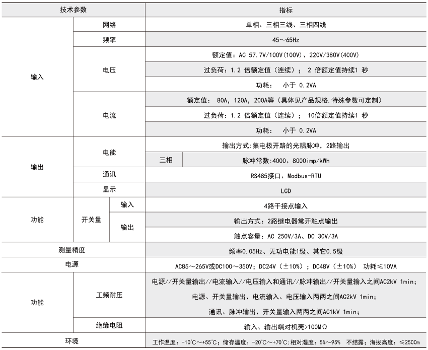 它集成全部電力參數的測量(如單相或者三相的電流、電壓、有功功率、無功功率、視在功率、頻率、功率因數等)、復費率電能計量、四象限電能計量、諧波分析以及電能監測和考核管理。多種外圍接口功能:帶有RS485/MODBUS-RTU協議;帶開關量輸入和繼電器輸出可實現斷路器開關的“遙信”和“遙控”的功能,采用LCD顯示界面,通過面板按鍵來實現參數設置和控制,非常適合于實時電力監控系統。