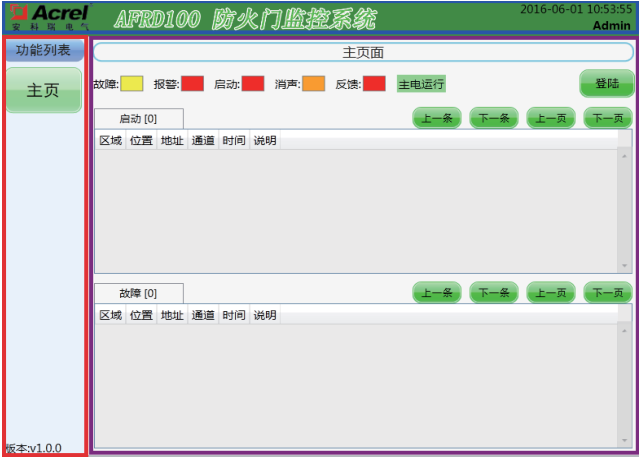 包含“登陸”按鈕、“界面標(biāo)題”、“功能列表”、“系統(tǒng)狀態(tài)欄”四部分組成,可以快速查詢當(dāng)前監(jiān)控狀態(tài),也可用于工作人員登錄操作。