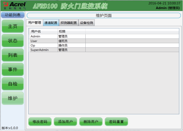 該界面設(shè)有三種操作級別,操作權(quán)限級別依次為“超級管理員”→“管理員”→“操作員”,其中高級別可添加低級別的新用戶。