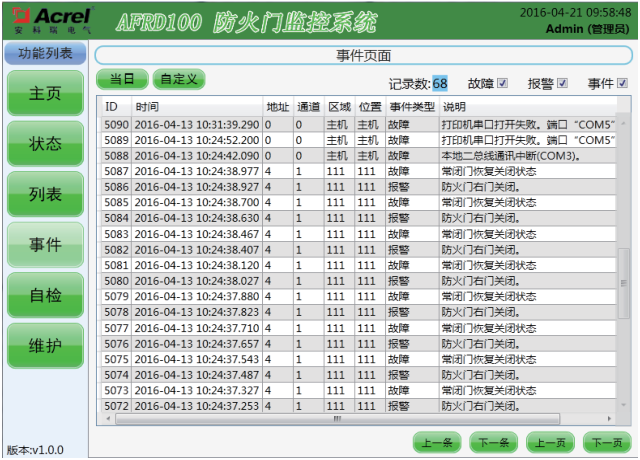 該界面可顯示當(dāng)前存儲的報(bào)警記錄、故障記錄和事件記錄,可選擇查詢當(dāng)天記錄也可以自定義查詢?nèi)掌凇?/p>