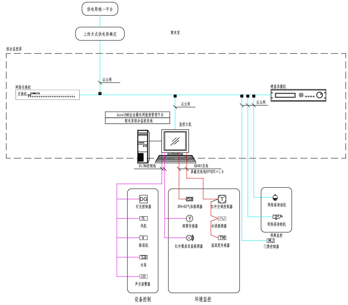 配電室綜合監控系統包括智能監控系統屏、通訊管理機、UPS電源、視頻監控子系統(云臺球機、槍機)、環境監測子系統(溫度、濕度、水浸、煙感)、控制子系統(燈光、空調、除濕機、風機、水泵)、門禁監控子系統(讀卡器、開門按鈕、磁力鎖)、安防監控子系統(雙鑒檢測器)。